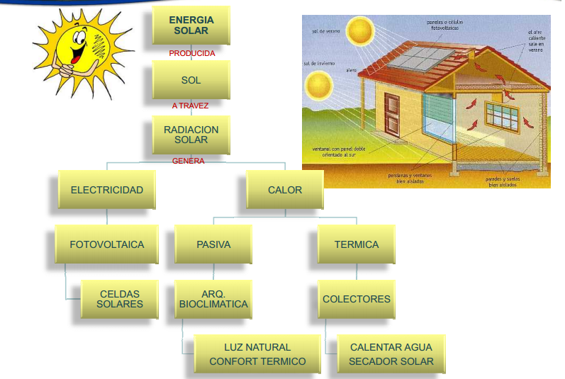 La energía solar es la energía obtenida a partir del aprovechamiento de la radiación electromagnética procedente del Sol. Es la energía producida por el sol y que es convertida a energía útil por el ser humano, ya sea para calentar algo o producir electricidad (como sus principales aplicaciones).